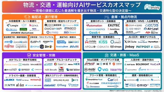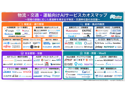 国内最大級のAIポータルメディア「AIsmiley」を運営する株式会社アイスマイリー(東京都渋谷区、代表取締役:板羽 晃司)は、現場の課題に応じた最適解を導き出す物流・交通特化型の決定版「物流・交通・運輸向けAIサービスカオスマップ」を、2026年3月10日(火)に公開しました。掲載総数は90製品以上です。