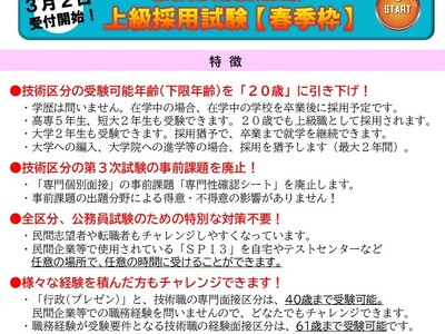 上級採用試験【春季枠】の申込受付を開始しました。一般技術員【土木・建築・電気・機械】については20歳(令和9年4月1日時点)から受験可能!