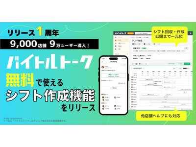 株式会社アイリッジ(本社:東京都港区、代表取締役社長:小田 健太郎、東京証券取引所グロース:3917、以下「アイリッジ」)は、ディップ株式会社(本社:東京都港区、代表取締役社長 兼 CEO:冨田 英揮、以下「ディップ」)と共同で開発した店舗管理者とアルバイト従業員のコミュニケーションを改善するサービス「バイトルトーク」が2025年2月のサービス開始から1周年を迎え、3,000社9,000店舗導入を果たしたことをお知らせします。
