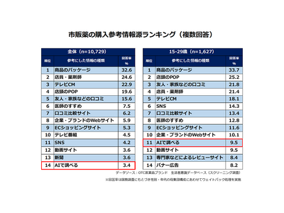 最近1年間に使用した一部の市販薬について、購入する際に参考にした情報収集源を調査したところ、商品のパッケージや店頭POP、友人・家族などの口コミなどの情報源が上位を占めていました。一方、20代以下では「AIで調べる」と回答した割合が9.5%と、全年代の中で最も高い結果となりました。割合としては10%未満ですが、全体と比較すると約2.8倍となっており、若年層において生成AIの活用が急速に進んでいることがうかがえます。