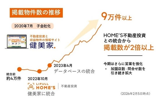 健美家は、不動産投資物件の網羅性を高め、ユーザーにより多くの選択肢を提供することを目指してきました。その実現に向けて、LIFULLグループである強みを活かし、2023年には「LIFULL HOME’S不動産投資」とのデータベース統合を実施、また、営業基盤を拡大し、掲載加盟店の導入推進を強力に進めました。その結果、健美家の物件掲載数は9万件以上(2026年2月5日時点)、「LIFULL HOME’S不動産投資」のデータベースとの統合前と比較すると2倍以上となり、不動産投資専門ポータルサイトにおいて最も掲載物件数が多いサイトとしてNo.1を獲得しました。