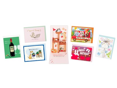 ギフト需要に応える花柄や乾杯デザインに加え、猫・ケーキ・観葉植物などトレンド感を取り入れた幅広いグリーティングカードが大集合!