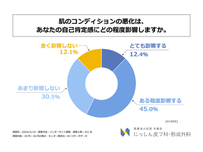 調査の最後、20代~50代の男女を対象に「肌のコンディションの悪化は、自身の自己肯定感にどの程度影響するか」を尋ねる設問への回答では、1位が「ある程度影響する」で45.0%、2位が「あまり影響しない」で30.5%、3位が「とても影響する」で12.4%という結果になりました。1位と3位の各回答の比率を合計すると57.4%となり、この結果から、20代~50代の男女の6割弱が、肌のコンディションの悪化は自身の自己肯定感に、程度の差こそあれ、影響すると考えていることが判明しました。