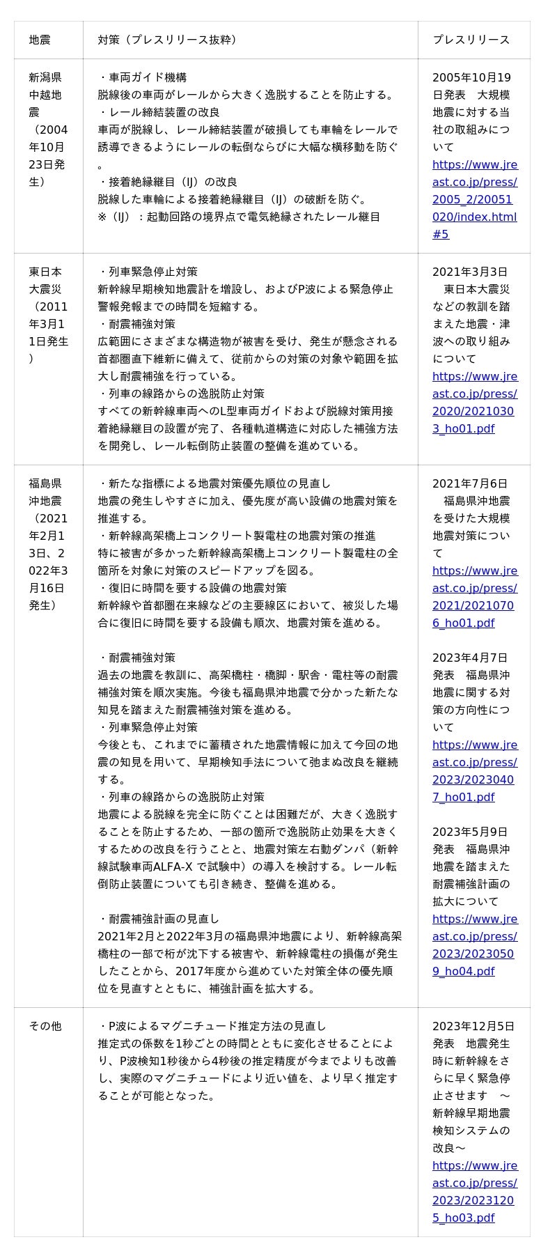 当社では、過去の地震を教訓とし、「設備の耐震補強対策」、「列車緊急停止対策」、「列車の線路からの逸脱防止対策」に取り組んでいます。このうち「列車の線路からの逸脱防止対策」について、2004年の新潟県中越地震での新幹線脱線事故の教訓を踏まえ、2008年から走行中の列車の脱線・逸脱のリスクを低減する地震対策ダンパの開発に(公財)鉄道総合技術研究所の協力を得ながら取り組んできました。