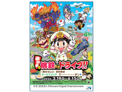 令和8年3月19日(木曜)から6月15日(月曜)まで高速道路のSA・PAで大人気すごろくゲーム「桃太郎電鉄」(発売元:株式会社コナミデジタルエンタテインメント)とのコラボイベント「西日本を桃鉄ドライブ!!」を開催します。 本イベントは、2月1日(日曜)までE2 山陽自動車道 吉備SA(上り線)で開催して好評を博した企画を、多くのお客さまにお楽しみいただけるよう西日本各地のSA・PAに拡大し、「桃鉄」コラボ銘菓の販売やオリジナル商品の販売、SA・PAを巡るデジタルスタンプラリーやショップ内コラボ装飾、限定グッズが当たるレシートくじ等を開催しますので、ぜひSA・PAにお立ち寄りいただき、「西日本を桃鉄ドライブ!!」をお楽しみください。