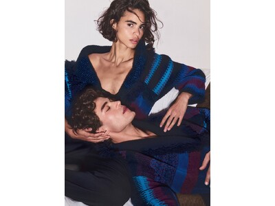 「長い旅路」を想起させるハワイ語に由来するAlanuiのスピリットは、ショールカラーに短く密度の高いフリンジをあしらい、ノットタイベルトで留めるスタイルのカーディガンに表現されています。そのシグネチャーアイテムは、アルマーニのレンズを通して再解釈され、ブルー、ライトブルー、アメシストの色調で描かれた、リズミカルなストライプによる抽象的なジャカードモチーフが特徴です。