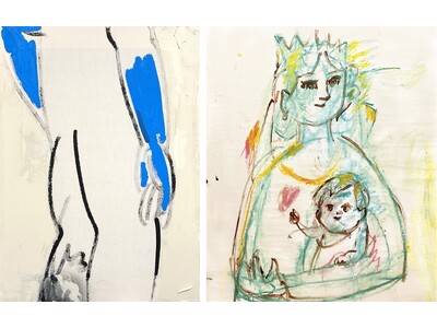 (写真左から)須田日菜子「おしり1.」(H480×W350mm/綿布、アクリル、スプレー/2026年)、植田工《A Mother, A Child》(H727×W606mm(F20号)/アクリル、オイルパステル、チョーク、キャンバス/2026)