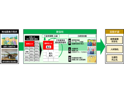 新会社は、一定の生産規模を持つにも関わらず、高齢化に伴い事業継続に課題を抱える農業法人等への出資及び経営支援を行うことで、地域内農業法人の事業継続に取り組みます。そして、この出資先農業法人を拠点として、同様に廃業や耕作放棄リスクのある周辺農地からの賃貸借・生産受託を担うことで、農地集約による規模拡大を通じたサステナブルな経営体制を構築し、今後の作付面積として1,500ha規模を目指していきます。