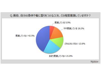 普段、身体や髪への香りづけを意識している人は、「意識している」「やや意識している」を合わせて2割強です。女性10・20代では、意識している人と意識していない人がいずれも4割強と拮抗しています。