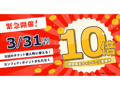 チケットサイト「カンフェティ」(運営:ロングランプランニング株式会社、東京都新宿区、代表取締役:榑松 大剛)にて、全会員対象のポイント10倍キャンペーンを3月11日(水)より開催いたしました。3月末までの期間限定開催となります。