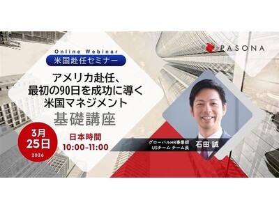 株式会社パソナは、米国赴任を予定している企業のご担当者や、米国拠点において人事・採用・組織運営に関わる責任者を対象に、ウェビナー「アメリカ赴任、最初の90日を乗り切る!米国拠点長・マネジャーのためのサバイバルガイド」を2026年3月25日(水)に開催いたします。