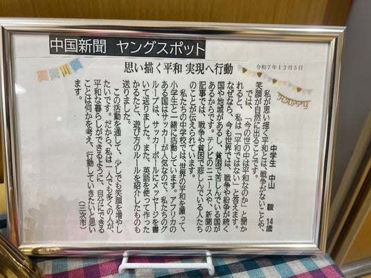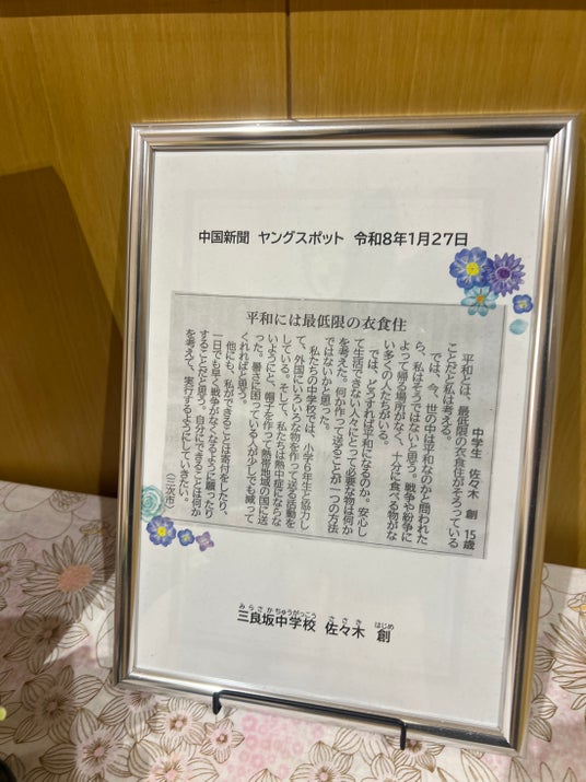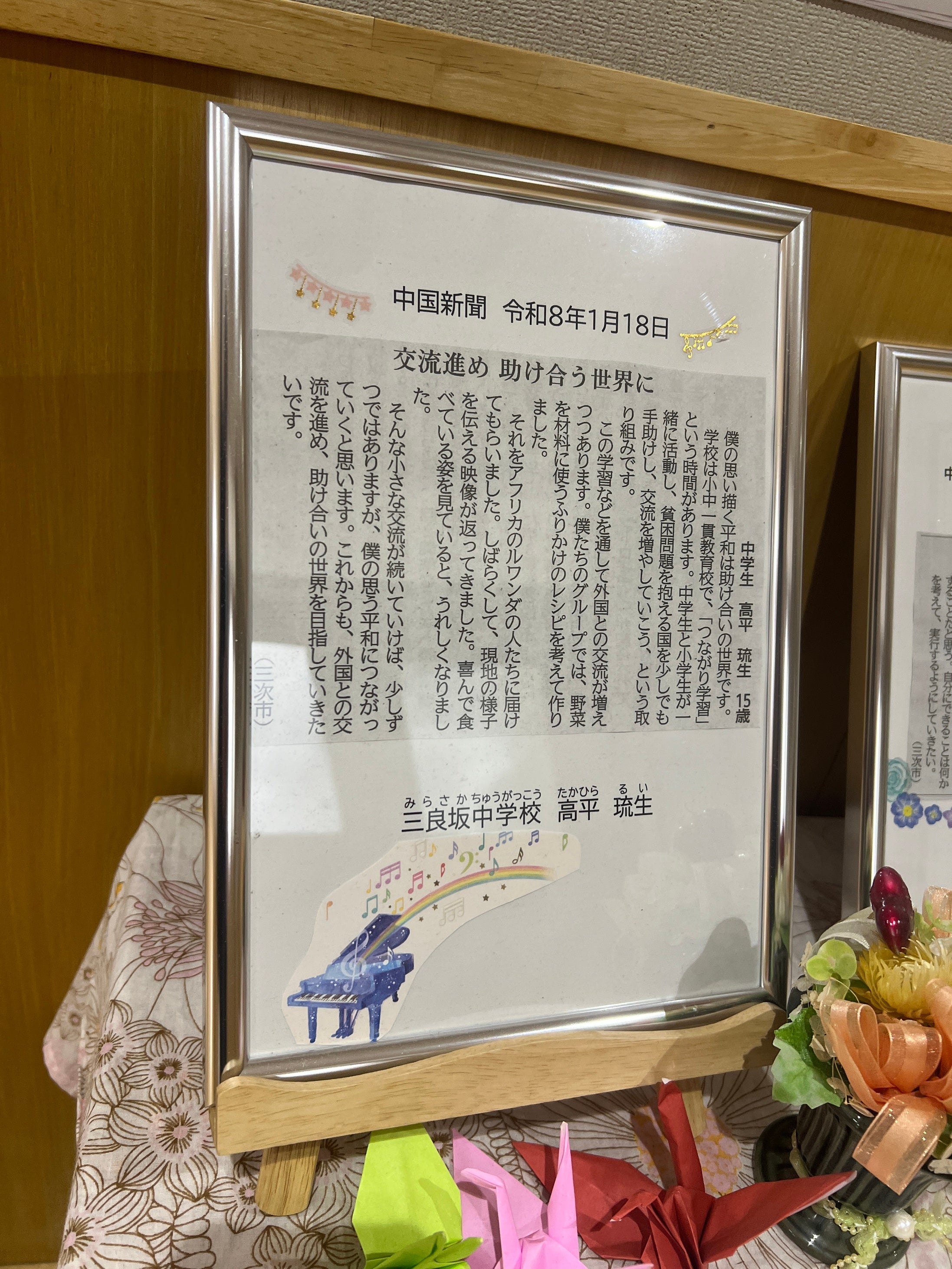 三良坂中学校の生徒たちが、「世界とつながる学習を通して学んだこと」をテーマに執筆した意見文は、中国新聞『ヤングスポット』にも掲載されました。そこには、「多角的な視点を持つことが平和につながる」「少しでも笑顔を増やしたい」「助け合いの世界を目指したい」「最低限の衣食住がそろうことが平和だと思う」など、子どもたち自身の言葉で平和や支援、行動の意味を考えた跡がはっきりと表れています。