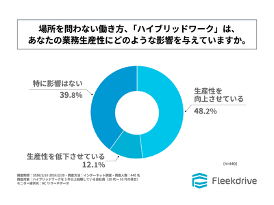 株式会社Fleekdriveは、ハイブリッドワークを1年以上経験している会社員(20代~50代の男女)を対象に「ハイブリッドワークにおける生産性に関する調査」を実施しました。この調査から、ハイブリッドワークを1年以上経験している会社員が感じるハイブリッドワークの生産性への影響や、コミュニケーションにおける課題感、会社に求めるサポートなどが明らかになりました。