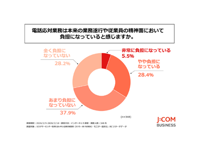 JCOM株式会社(本社:東京都千代田区、代表取締役社長:岩木 陽一)は、カスタマーセンターを持たない中小企業の経営者(20代~60代の男女)を対象に「中小企業の電話応対業務に関する調査」を実施しました。この調査から、カスタマーセンターを持たない中小企業の経営者が感じている電話応対業務の負担や人財不足、若手社員の電話離れの実態などが明らかになりました。