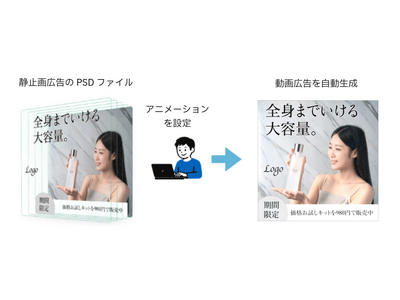 こうした課題を解決するため、Hakuhodo DY ONEは、静止画広告のPSDファイルを活用し、多様な動画クリエイティブを自動生成できるサービスの提供を開始いたします。本サービスにより、専門的な編集スキルがなくても、コピーやロゴ、商品画像など主要な要素に自在な動きを加えながら、ブランドイメージを損なうことなく、高品質な動画広告を柔軟に制作することができます。これにより、広告主は豊富なバリエーションのクリエイティブを効率的に展開でき、ABテストや配信最適化も容易に実施できるため、広告効果の最大化につなげることが可能です。