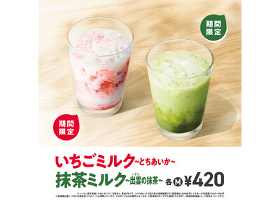 モスバーガーを展開する株式会社モスフードサービス(代表取締役社長:中村 栄輔、本社:東京都品川区)では、2026年3月18日(水)~5月中旬まで、全国のモスバーガー店舗(一部店舗を除く)にて、「いちごミルク ~ とちあいか ~」と「抹茶ミルク ~ 出雲(いずも)の抹茶 ~」を期間限定で販売します。