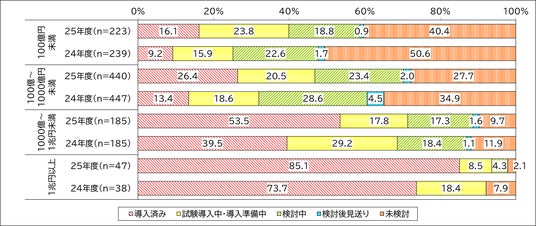 特筆すべきは売上高1兆円以上の大企業であり、「導入済み」の割合のみで85.1%に達し、すでに業務において必須のツールとなっていることがうかがえます。(図2)