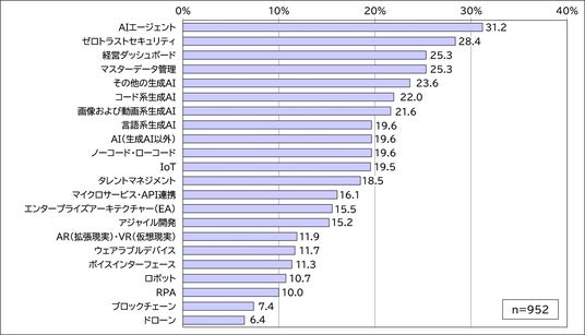 生成AIの活用領域の多様化と合わせて進みそうなのが、AIの自動化・自律化です。本調査では、新規テクノロジーへの関心度を測るために、様々なテクノロジーの導入状況を尋ねています。今回の調査から「AIエージェント」を選択肢として追加したところ、導入を「検討中」と回答した企業の割合が最も高い31.2%でした。(図4)