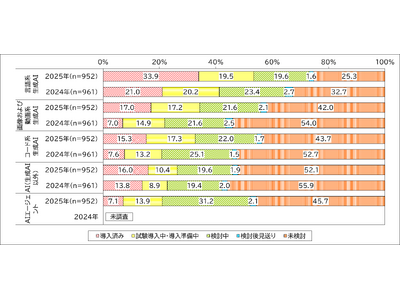 生成AIの活用領域の多様化も進んでいます。「言語系」にとどまらず、「画像および動画系生成AI」の導入・試験導入が34.2%、「コード系生成AI」が32.6%と、それぞれ前年度から10ポイント以上の大きな伸びを示しました。生成AIの活用は、テキスト処理からシステム開発やクリエイティブ領域へと着実に裾野を広げています。(図1、3)