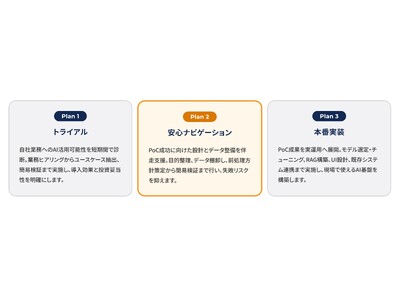 本サービスでは、目的と規模に応じて選択できる3つの導入プランを用意しています。「スモールスタートから全社展開へ」をコンセプトに、トライアル(最小構成)、安心ナビゲーション(実用化検証)、本番実装(全社展開)という段階に応じてお選びいただけます。初期投資を最小化しながら、将来の拡張性を確保し、部門展開・複数拠点展開へとスケール可能なAI基盤を構築します。
