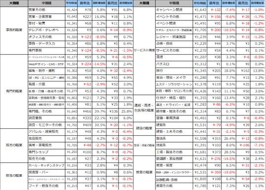 事務的職業は1,377円(前年比50円増、前月比4円減)、専門的職業は 1,572円(前年比143円減、前月比38円増)、飲食の職業は1,217円(前年比36円増、前月比3円増)、販売の職業は1,210円(前年比6円減、前月比1円減)、サービスの職業は1,370円(前年比70円増、前月比18円増)、運搬・清掃・包装等の職業は1,350 円(前年比102円増、前月比21円増)、建設の職業は1,507円(前年比84円減、前月比31円増)、製造・技能の職業は1,550円(前年比341円増、前月比5円減)、教育の職業は1,585円(前年比151円減、前月比9円増)となりました。