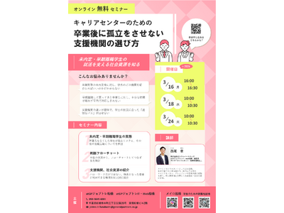障害者の就労支援を中心にソーシャルビジネスを展開する株式会社ゼネラルパートナーズ(本社:東京都千代田区、代表取締役社長:進藤均)は、2026年3月16日(月)、3月18日(水)、3月24日(火)に、教育機関向けオンラインセミナー「キャリアセンターのための卒業後に孤立をさせない支援機関の選び方」を開催します 。