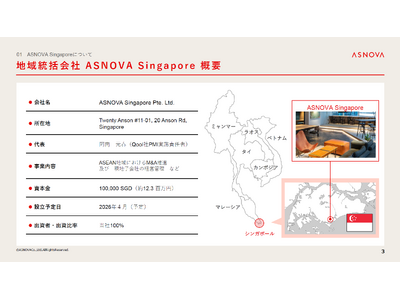 くさび式足場のレンタル・販売を提供する株式会社 ASNOVA(本社所在地:愛知県名古屋市、代表取締役社長 上田桂司、以下「当社」)は2026年3月13日(金)の取締役会において、ASEAN地域でのM&A加速を主たる目的とした、地域統括会社「ASNOVA Singapore」を設立することを決議いたしましたのでお知らせいたします。