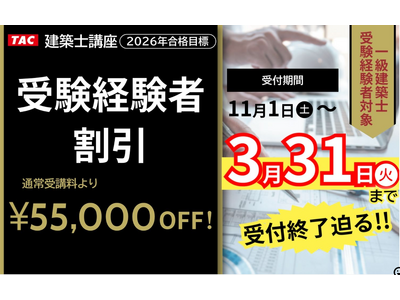 一級、二級建築士対策講座を展開しているTAC株式会社(東京都千代田区、代表取締役:多田敏男)は、2026年3月31日(火)まで学科対策コースを対象とした割引キャンペーンを実施中です。