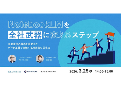 Google Workspace のプレミア パートナー(Services / Co-sell)である吉積情報株式会社(本社:東京都千代田区、代表取締役:秋田晴通、以下「吉積情報」)は、2026 年 3 月 25 日にグループ会社であるクラウドエース株式会社(本社:東京都千代田区、代表取締役社長:吉積礼敏、以下「クラウドエース」)との共催により、Google の提供する AI リサーチツール「NotebookLM」をビジネスの基盤として定着させるための実践的セミナーを開催いたします。