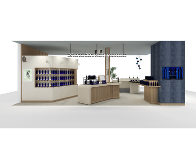 心地よさとサステナビリティを両立させた空間をめざし、内装には回収したブルーボトルを埋め込んだテーブルや、ジーンズの端材から生まれた左官材「塗るデニム」など可能な限り自然に還る素材やリサイクル、リユース、アップサイクルした素材を採用いたしました。精油から始まる香りの世界をより感じていただけるコーナーを設け、アロマ、ボディケア、スキンケアなどの製品をゆっくりとお試しいただけます。