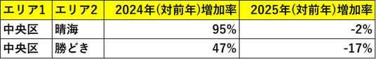 しかし2025年になると状況は一転し、再販マンション増加率は前年比マイナス2%となりました。特に「晴海」「勝どき」といった湾岸エリアでは、再販投資が急速に減速する動きが見られています。
