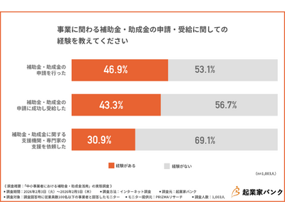 起業家バンク(所在地:大阪府大阪市、代表取締役:前薗 浩也)は、従業員数100名以下の事業者(補助金・助成金に興味がある)を対象に「中小事業者における補助金・助成金活用」の実態調査を行いました。