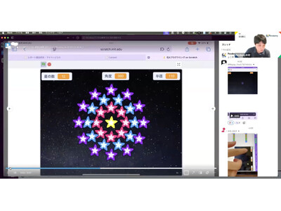 Scratchで星の配置を工夫しながら、オリジナルの花火プログラミングに挑戦する授業の様子