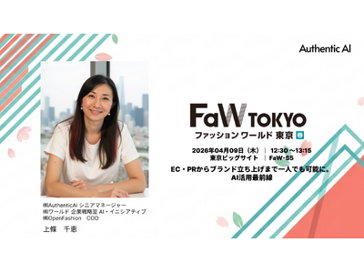 企業向け生成AIプラットフォームを開発・提供する株式会社AuthenticAI(本社:東京都港区、代表取締役:上田 徹、以下オーセンティックAI社)は、2026年4月8日(水)~10日(金)に東京ビッグサイトで開催される日本最大級のファッション総合展「FaW TOKYO 2026(第29回 ファッション ワールド東京)春」にて、当社の上條千恵が登壇することをお知らせいたします。講演では、生成AIの活用により「一人でのブランド創設」を可能にする、アパレル業界の最新DX事例について詳説します。