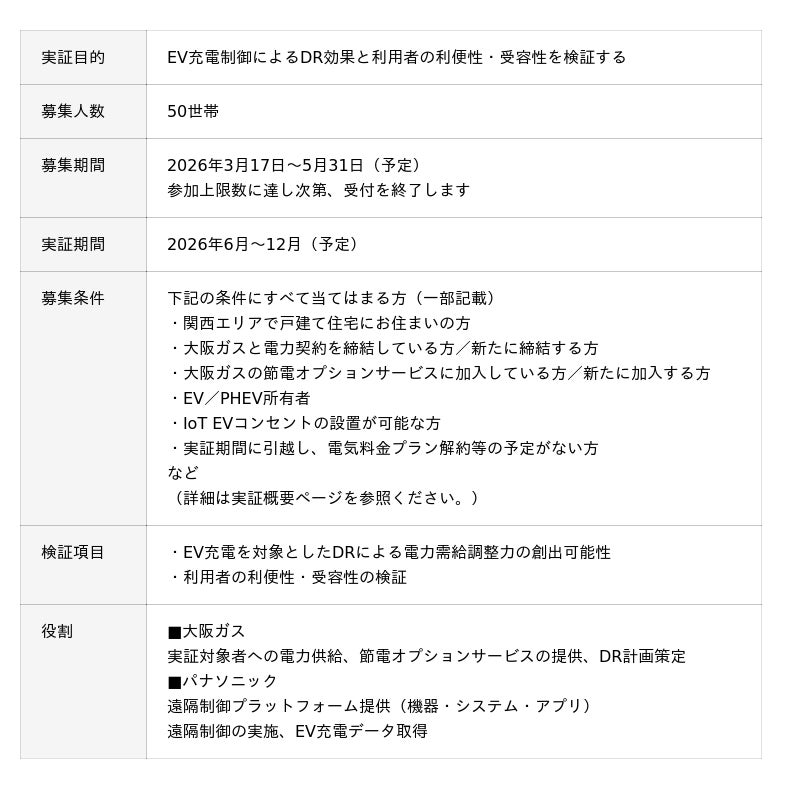 本実証では、2026年6月から12月までの期間、関西エリアの戸建住宅50世帯を対象に、大阪ガスの「節電オプション」とパナソニックが提供する「おうちEV充電サービス」アプリおよびIoT EVコンセント(※3)を連携させ、遠隔でEV充電を制御します。