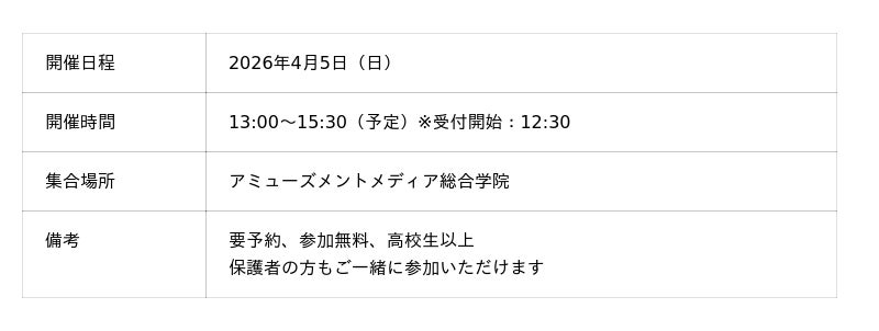 声優という職業への理解を深めるとともに、進路選択の参考としてご参加いただける機会です。