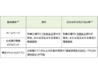 これまで東京メトロでは、ホームページ及び公式運行情報 X(旧Twitter)アカウントにおいて、「列車の運行に15分以上の遅れが発生、または見込まれる場合」に情報を配信してまいりました。今後は、