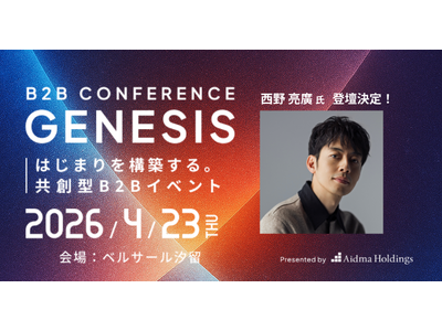 株式会社アイドマ・ホールディングス(本社:東京都品川区、代表取締役:三浦 陽平、以下:当社)は、「B2B CONFERENCE GENESIS 2026」を2026年4月23日(木)にベルサール汐留で開催します。本カンファレンスは、立場や業種を超えて価値を交換し合い、ともに成長を目指す“共創型B2Bイベント”として企画されました。ピッチ大会や基調講演、交流会などを通じて、企業同士の事業提携や投資機会の創出を目指す大型ビジネスカンファレンスです。メインスピーカーには、芸人・童話作家/株式会社CHIMNEY TOWN 代表取締役社長の西野 亮廣 氏が登壇します。