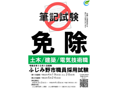 ふじみ野市では、昨今の人材獲得競争の激化を鑑み、公務員になるために従来は必須と考えられていた筆記試験(公務員試験)を一定の資格を保有していることを条件に完全免除し、面接2回のみで職員採用試験を実施しています。採用の時期は令和8年10月1日を予定しています。