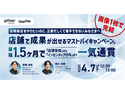 株式会社NTTドコモのマーケティング分野における新規事業型子会社である株式会社DearOne(本社:東京都港区、代表取締役:河野 恭久、以下:DearOne)が提供する、リテールメディアプラットフォーム「ARUTANA」は、eギフトプラットフォーム事業(※1)を展開する株式会社ギフティ(本社:東京都品川区、代表取締役:太田 睦、鈴木 達哉、以下:ギフティ)とともに、2026年4月7日(火)12時30分から無料ウェビナーを開催いたします。