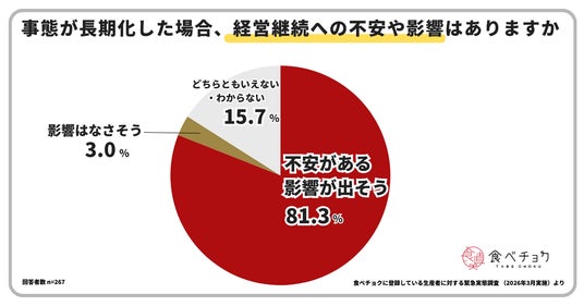 調査の結果、約7割の生産者がすでに影響を実感していることが明らかになりました。さらに長期化が進む際には、約8割の生産者が今後の経営への影響を懸念しており、価格転嫁が進まない中で、生産縮小や廃業リスクの高まりが浮き彫りとなりました。