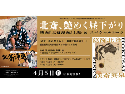 株式会社東急レクリエーション(本社:東京都渋谷区、社長:木村 知郎)は、2023年4月に開業した「東急歌舞伎町タワー」内の「109シネマズプレミアム新宿」で、新宿歌舞伎町能舞台を中心に開催される「葛飾北斎・渓斎英泉 艶くらべ ー歌舞伎町花盛りー新宿歌舞伎町春画展WA」とのコラボ企画として、映画『北斎漫画』を35mmフィルムで特別上映する「北斎、艶めく昼下がり。― 映画『北斎漫画』上映&スペシャルトーク ―」を2026年4月5日(日)の1日限定で実施します。上映後には、新宿歌舞伎町春画展WAの監修を務める浦上満氏と新宿歌舞伎町春画展の企画者である手塚マキ氏が、今回の展示や北斎の魅力を語り尽くすトークイベントも行います。