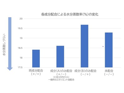 新処方について、目指した効果が実現しているか否かを確認しました。まず、保湿の持続性について確認を行いました。30℃の環境下で蓋をしていないスクリュー管に製剤を入れ、24時間後の水分蒸散量を確認しています。(A)はコメ発酵成分、(B)はエステル油です。両成分および(A)のみ配合(※(B)の代わりに一般的なエモリエント油を配合)した処方は、水分蒸散が抑制されていることがわかりました。