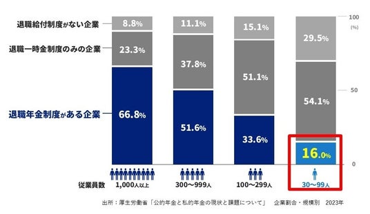 日本の全企業数のうち、中小企業数は99.7%、中小企業で働く従業員数は69.7%*²と非常に多いなか、従業員規模30~99人の企業で退職年金制度がある企業はわずか16%*³にとどまっています。