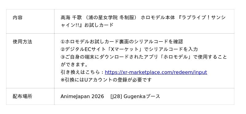 Gugenkaブース(J28)へお越しいただいた方に、『ラブライブ!サンシャイン!!』高海 千歌のホロモデルが体験できる「ホロモデルお試しカード」をプレゼントいたします。