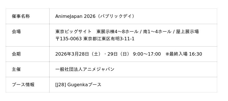 株式会社Gugenka(代表取締役CEO 三上昌史)は、2026年3月28(土)・29日(日)の2日間にわたり開催される「AnimeJapan 2026」パブリックデイに出展いたします。