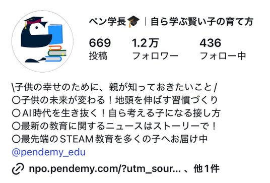 最先端のデジタル技術とものづくりを融合したSTEAM教育を企画開発する株式会社Pendemy(本社:東京都府中市、代表取締役:木村隼人)は、自社で運営する公式Instagramアカウント「ペン学長?|自ら学ぶ賢い子の育て方(@pen_gakucho)」のフォロワー数が2026年2月20日に1.2万人を突破したことをお知らせいたします。