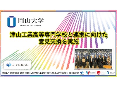 国立大学法人岡山大学(本部:岡山市北区、学長:那須保友)は、2026年2月26日、津山工業高等専門学校(津山高専)の寺元貴幸副校長、薮木登副校長、竹中正巳総務課長、立間淳司特命教授、吉富秀樹特命教授、中野絵美総務課職員らが来学し。本学津島キャンパスの共創イノベーションラボ(きびのべ:KIBINOVE)において、河本雅紀研究・イノベーション共創管理統括部長らと意見交換・建物視察を行いました。