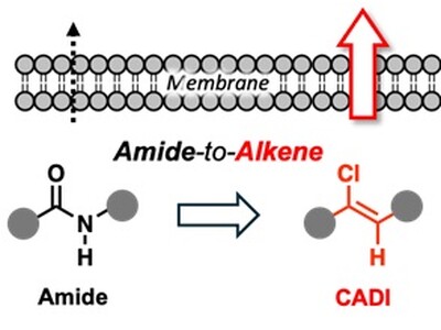 アルケンジペプチドイソスター (ADI) は、ペプチド結合を結合長と結合角がよく似た炭素-炭素二重結合に置換した構造的に類似したバイオイソスターです。これまでの研究から、ペプチドにADIを導入すると、酵素による分解を受けにくくなるだけでなく、ペプチドの形(立体構造)を整えることが可能であることが報告されてきました。本研究では、これまで十分に調べられてこなかったADIの「水素結合の性質」に着目し、それが膜透過性にどのような影響を与えるのかを検証しました (図1)。