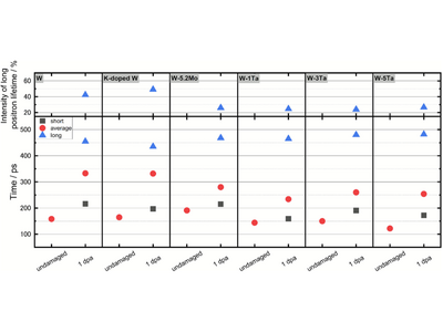 陽電子寿命測定法(PAS) (注1)により欠陥のサイズと密度を評価した結果を図1に示す。PASでは1 dpaの照射後に平均陽電子寿命が200 ps超へ増加し、長寿命成分が約500 psに達しボイドが形成されたと考えられる。W-TaおよびW-Moでは長寿命成分の割合が純Wより低く、ボイド密度が抑制されたことが分かったが、K-doped WはWと同程度であった。重水素滞留挙動を評価するため、重水素イオン照射後に